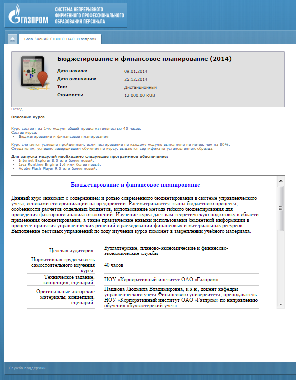 В частности, разработаны материалы для дистанционного курса «Бюджетирование и финансовое планирование» по поручению НОУ «Корпоративный институт ОАО Газпром».