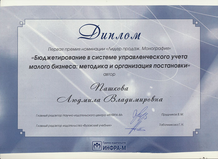 Монография по бюджетированию в системе управленческого учета малого бизнеса (в соавторстве с М.А. Вахрушиной) отмечена дипломом издательства.